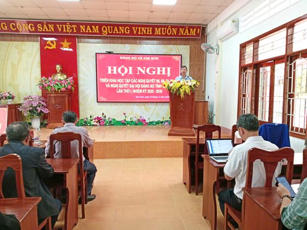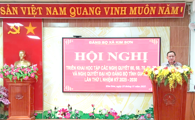 Sáng ngày 25/11/2025, tại Hội trường UBND xã Kim Sơn, Đảng uỷ xã đã tổ chức Hội nghị triển khai các nghị quyết 59, 66, 68, 70, 71, 72, của Trung ương, Bộ chính trị và Nghị quyết Đại hội đại biểu Đảng bộ tỉnh lần thứ I, nhiệm kỳ 2025–2030. Dự Hội nghị có đồng chí Hồ Minh Đức, Bí thư Đảng uỷ-Chủ tịch HĐND xã; Đồng chí Nguyễn Văn Thiện, Phó bí thư Đảng uỷ-Chủ tịch UBND xã; các đồng chí là Bí thư, Phó Bí thư, chi uỷ viên và 98 Đảng viên của 7 chi bộ thôn (thuộc Đảng bộ xã Ân Nghĩa củ).