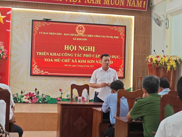 Sáng ngày 22/9, UBND xã Kim Sơn tổ chức hội nghị triển khai công tác Phổ cập giáo dục, xoá mù chữ trên địa bàn xã năm 2025. Dự hội nghị có đồng chí: Trần Văn Thư, UVBTV Đảng uỷ- chủ tịch UBMTTQVN xã; đồng chí Lê Quang Thắng, trưởng phòng VHXH; đại diện các trường học, cán bộ chuyên trách công tác phổ cập giáo dục, xoá mù chữ của các trường trên địa bàn.