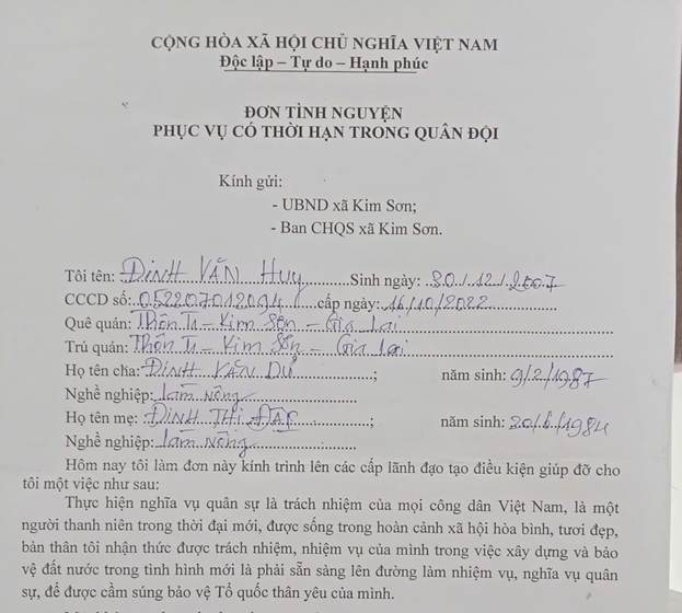 Thanh niên Đinh Văn Huy nộp đơn tình nguyện nhập ngũ năm 2026