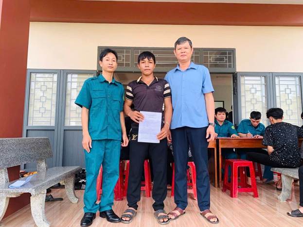 Thanh niên Đinh Văn Uyn, thôn T2 (đứng giữa) viết đơn tình nguyện tham gia NVQS năm 2026
