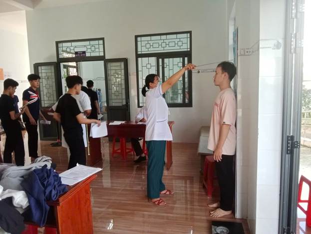 Tại buổi khám sơ tuyển, các y, bác sĩ của Trạm Y tế xã tiến hành kiểm tra toàn diện các chỉ số thể lực cơ bản: đo chiều cao, cân nặng, vòng ngực cùng khám lâm sàng cần thiết theo quy định.