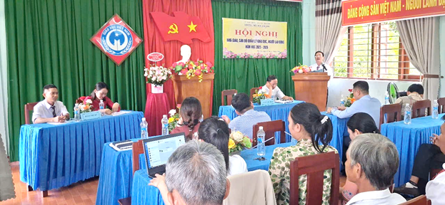 Phát biểu tại Hội nghị, đồng chí Lê Quang Thắng, trưởng phòng VHXH xã: biểu dương những thành tích mà cán bộ, viên chức đã đạt được, bên cạnh đó yêu cầu cán bộ, viên chức nhà trường cùng nêu cao vai trò, trách nhiệm tự học tập, tự bồi dưỡng để nâng cao trình độ, góp phần tích cực vào sự nghiệp giáo dục của nhà trường. Năm học 2025 - 2026 là năm đầu tiên thực hiện chính quyền địa phương hai cấp, đòi hỏi sự quyết tâm cao của tập thể giáo viên, cán bộ quản lý; củng cố tư tưởng, bản lĩnh chính trị cho đội ngũ; quan tâm công tác phát triển đảng viên trong nhà trường; chuẩn hoá đội ngũ giáo viên nhà trường gắn với nâng cao chất lượng dạy và học. Cùng với đó, nhà trường cần xây dựng phương hướng, nhiệm vụ, chỉ tiêu sát thực tế, mở rộng diện tích trường, đầu tư cơ sở vật chất tại trường để đảm bảo tốt nhất cho công tác dạy và học. Nhà trường tiếp tục đặt trọng tâm vào nâng cao chất lượng giáo dục toàn diện, đẩy mạnh chuyển đổi số, đổi mới phương pháp dạy học theo hướng phát triển phẩm chất, năng lực học sinh; củng cố cơ sở vật chất, đội ngũ và duy trì các danh hiệu thi đua.