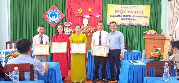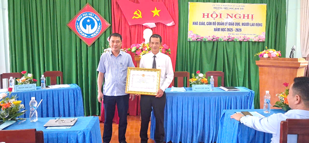 Ông Hoàng Quốc Tuấn, Phó bí thư TT Đảng uỷ và Ông Lê Quang Thắng, Trưởng phòng VHXH trao giấy khen giáo viên đạt thành tích cao tron năm học 2024-2025